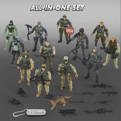 - This complete military playset includes 12 highly detailed 4-inch figures (Army, Marine, and Special Police themes), 2 fortification figures, 1 K-9 dog figure, and a customizable name tag. Each soldier features unique, realistic designs for immersive play!