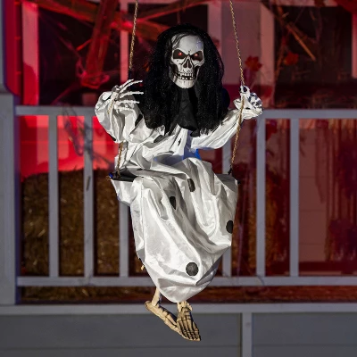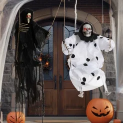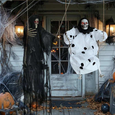 - Hanging Ghosts Halloween Outdoor Decoration. These LED-lit swinging skeletons create eerie eye glow and dynamic movement, with contrasting black and white for layered scares.