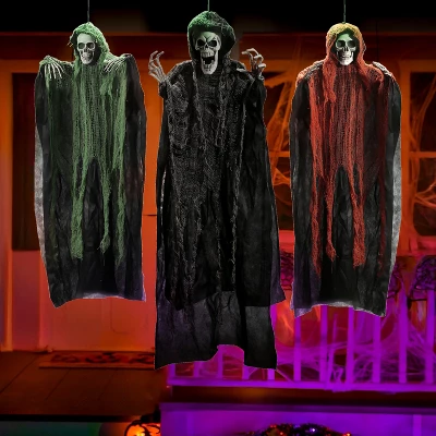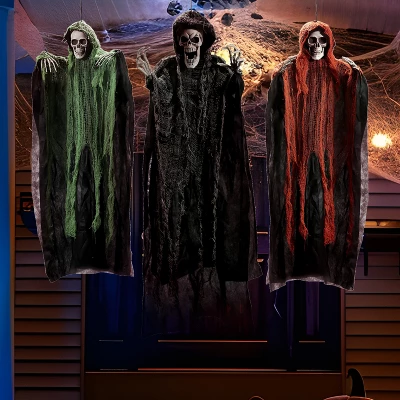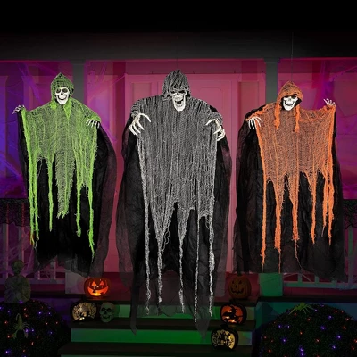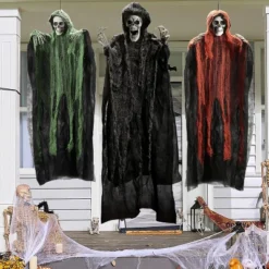 - Package includes 3 Hanging Ghost Figures. Features a striking black reaper (47”/120cm) and two smaller ghosts (35”/90cm) in green and orange, each with an attached hanging rope for easy setup.