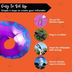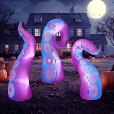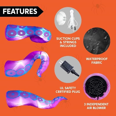 This Halloween Inflatable Purple Octopus Tentacle Decoration makes a dramatic statement with its lifelike, undulating tentacles that seem to crawl out of the shadows. With three massive tentacles measuring 4.5 ft, 5 ft, and 6 ft long, this inflatable creates a dynamic, larger-than-life display that instantly transforms any space into a haunting underwater nightmare. The intricate detailing on the suction cups and textured skin enhances its eerie realism, ensuring it stands out as a captivating centerpiece for your Halloween party or yard haunt. Designed for stability in outdoor conditions, it includes an extended power cord, heavy-duty suction cups, and reinforced fastening ropes to keep the tentacles firmly anchored, even in windy weather. The UL-certified plug guarantees safe operation, so you can enjoy the spectacle without worry. Whether draped over a haunted porch, wrapped around a tree, or emerging from a fog-filled graveyard, this blow-up octopus tentacle adapts to any Halloween theme.