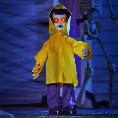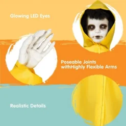 - Standing 31.5″ tall, this ultra-realistic raincoat boy adds an authentic terrifying presence to any indoor or outdoor Halloween setup.