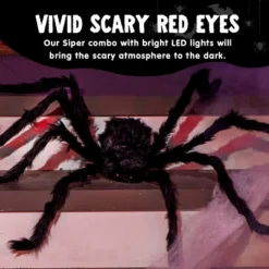 Terrify your neighborhood with our life-sized 63″ spider trio! These massive 5.2ft decorations feature ultra-realistic black hair and glowing red eyes. The fully poseable legs let you create creepy crawling positions on fences, trees or windows, while the lightweight yet durable construction ensures they’ll haunt your Halloween for years. Perfect for transforming your yard into a nightmare zone or creating the ultimate haunted house experience. Watch trick-or-treaters freeze in terror when they spot these gigantic arachnids lurking around your property!