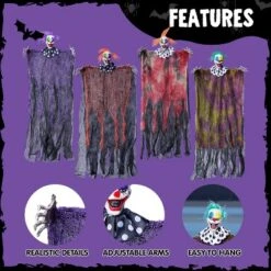 Turn your home into a haunted nightmare with our terrifying clown decorations! This clown halloween decorations set includes four 29″ hanging clowns in spine-chilling green, purple, orange and black – large enough to give every visitor goosebumps! Perfect for creating an instant haunted house atmosphere, these creepy clowns install in seconds on trees, windows or walkways. Their oversized design ensures maximum scare factor for Halloween parties, haunted trails or outdoor displays. Made from durable materials that withstand the elements, you’ll reuse these decorations year after year.