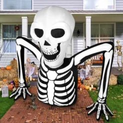 Behold our striking 5.5-foot-long half-skeleton inflatable decoration—a spine-chilling addition to your Halloween setup. With its eerie, hollow-eyed gaze and sinister skeletal grin, this haunting figure commands attention, evoking both fascination and dread. Standing at an imposing 5.5 x 2.3 x 5 feet, this lifelike half-skeleton emerges as if clawing its way from the grave, making it a macabre centerpiece for any Halloween display. Whether positioned indoors or outdoors, the illuminated skeleton creates haunting silhouettes and unsettling shadows, transforming any space into a nightmare-inducing spectacle. Perfect for setting the mood at parties, haunted attractions, or even as a standalone yard display, its sinister radiance ensures an unforgettable Halloween experience.