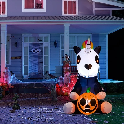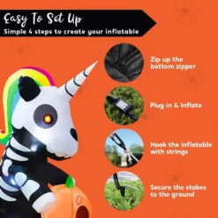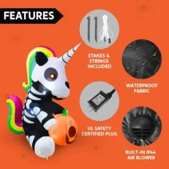 This 5ft tall Halloween Inflatable Sitting Skeleton Unicorn is an excellent design that brings a whimsical yet spooky charm to your outdoor Halloween decor. Perfect for transforming your yard into a festive and eerie wonderland, this unique inflatable combines the mythical allure of a unicorn with the playful creepiness of a skeleton, creating a standout piece that will delight trick-or-treaters and guests alike. Designed for durability and stability, it comes equipped with an extended power cord, sturdy ground stakes, and fastened ropes to keep it firmly anchored, even on windy nights. Beyond its striking appearance, this inflatable boasts great functionality with its bright built-in LED lights, making it highly visible from a distance. When illuminated in the evening, the glowing skeleton unicorn becomes a mesmerizing centerpiece, drawing attention and adding an enchanting yet eerie ambiance to your Halloween setup. Whether placed on the lawn, near the porch, or as part of a larger haunted display, it effortlessly elevates your outdoor decor.