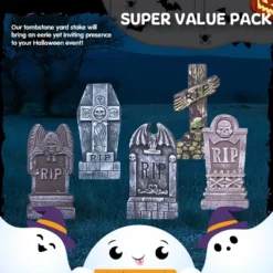 - This Foam RIP Graveyard Tombstones includes five 17″ foam tombstones and 12 sturdy metal stakes for secure outdoor display.
