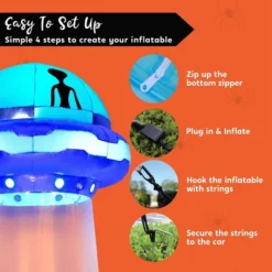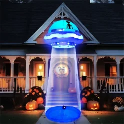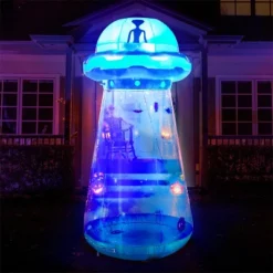 Prepare to be amazed by our spectacular Halloween inflatable UFO—a show-stopping centerpiece that will instantly elevate your spooky celebrations! Towering at an impressive 6/9/12 feet, this intricately designed UFO features realistic alien spacecraft details, from its mysterious glowing panels to its futuristic metallic sheen. (Cow Not Included!!!) Designed for stability in all conditions, it comes equipped with an extended power cord, heavy-duty ground stakes, reinforced fastened ropes, built-in sandbags for weight distribution, and a UL-certified plug for safe operation. Whether hovering over your front yard or “landing” at your Halloween party, this UFO demands attention with its larger-than-life presence. Perfect for nighttime scares, the UFO’s radiant glow ensures it remains the star of your Halloween setup, whether placed in a haunted yard or as part of an extraterrestrial-themed party.