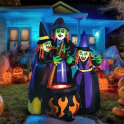 Transform your yard into a scene straight from a witch’s lair with our 6-foot-tall three witches cauldron inflatable! This spellbinding decoration features three eerie witches gathered around a bubbling cauldron with mesmerizing LED flame effects that glow ominously at night. Crafted from premium, weather-resistant materials, this UL-certified centerpiece comes complete with ground stakes, fastening ropes, and extended cords for easy setup. Whether you’re hosting a haunted house party, trick-or-treat event, or just want to scare your neighbors, this dynamic inflatable brings professional-grade Halloween magic to your home. The built-in LED lights create an enchanting nighttime display that will have everyone under its spell!