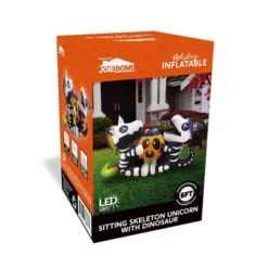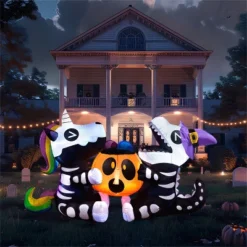 Bring some whimsical fright to your Halloween celebrations with this 6-foot-long sitting skeleton unicorn with a dinosaur-themed inflatable! This unique and playful design combines spooky and adorable elements, making it a standout piece for your holiday decor. Whether you’re hosting a haunted house, a trick-or-treat event, or just want to add some festive flair to your yard, this skeleton unicorn inflatable is the perfect choice. Its charming yet spooky design works great for outdoor Halloween displays, garden decorations, holiday parties, and more. Too cute to be truly frightening, it’s ideal for family-friendly Halloween fun, ensuring your home becomes the talk of the neighborhood—especially when lit up at night for visiting trick-or-treaters!
