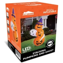 This 6ft tall Halloween inflatable stacked pumpkin is the perfect blend of scary charm and convenience, making it an eye-catching addition to your holiday yard decorations. Towering over your lawn with its whimsical stacked pumpkin design, this inflatable instantly creates a festive Halloween atmosphere that will delight visitors of all ages. Our outdoor Halloween inflatable decoration takes your holiday display to the next level with its vibrant built-in LED swirling lights. The dynamic lighting effects create a mesmerizing glow that can be seen from a distance, making your home the highlight of the neighborhood after dark. Whether placed in your front yard, garden, or along your walkway, this illuminated stacked pumpkin becomes an enchanting centerpiece that draws attention from trick-or-treaters and party guests alike. The automatic dusk-to-dawn feature ensures your decoration lights up every evening, creating a magical Halloween ambiance with zero effort.