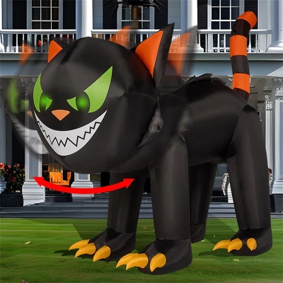 - 7-foot crawling cat with realistic shaking head motion and glowing green F5 LED eyes for maximum scare factor!