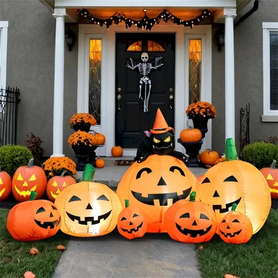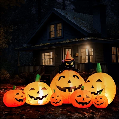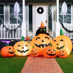This magnificent 7ft long Halloween inflatable featuring 7 scary pumpkins with a witch’s cat perched menacingly on top creates the perfect eerie atmosphere for your Halloween night. Towering over your yard, this eye-catching decoration combines classic Halloween symbols into one impressive display that will be the talk of the neighborhood. Crafted with premium quality in mind, this UL-certified Halloween inflatable is built to withstand the elements season after season. The heavy-duty, waterproof polyester material resists tearing, while the stitching and reinforced seams ensure your decoration stays fully inflated without leaks or sagging. The high-performance built-in blower maintains constant inflation with quiet operation, keeping your spooky scene looking perfect from the first trick-or-treater to the last party guest.