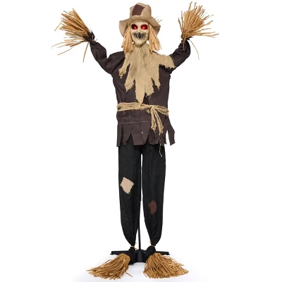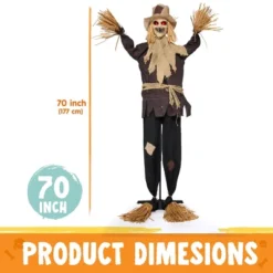 Elevate your Halloween decor with our 70” Animatronic Standing Scarecrow! Whether indoors or outdoors, this prop delivers scares and delights that’ll make your Halloween decorations the talk of the town. Get ready to create a farm of frights and fun that’ll leave everyone screaming for more! Transform your Halloween party into a haunted farm with our Standing Scarecrow. It’s versatile and can be used in many different Halloween occasions. Equipped with advanced proximity sensors, this interactive scarecrow springs to life when anyone approaches within 50cm. The moment it detects movement and sound, the frightening magic begins – its body shakes violently as if coming alive, while glowing eyes light up with an eerie glow and sinister sounds echo through the air. Whether you’re hosting a Halloween party or just looking to add some decor to your home, farm, Haunted House and more! Our animatronic standing scarecrow is a perfect choice.