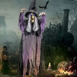 - 72″ Light-Up Talking Hanging Witch. Towering Halloween decoration with eerie illumination and sound effects for maximum scare factor.