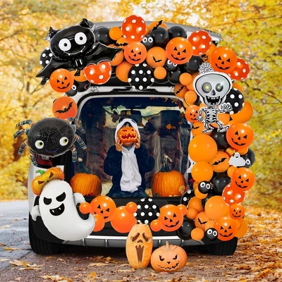 - Complete Halloween Balloon Kit. Get everything you need in one box – 75 latex balloons (multiple styles/sizes) plus 4 large foil balloons (bat, skeleton, spider & ghost), plus tape and glue dots. Perfect for car trunk decorations or indoor/outdoor Halloween setups.