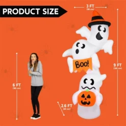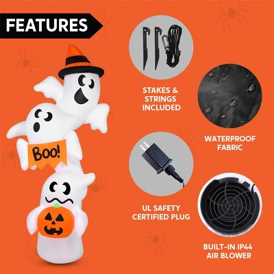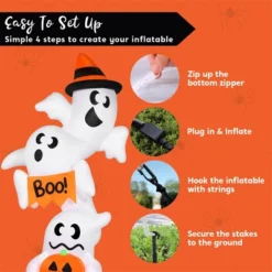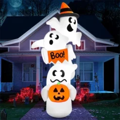 Bring a delightful mix of cute and creepy to your Halloween display with this charming inflatable featuring three adorable little white ghosts. Designed in a unique overlapping stack, these ghosts create a visually striking and whimsical scene that instantly elevates your outdoor decor. Their glowing eyes and cheeky smiles add personality, making them a perfect addition to your Halloween decorations outdoor ghost collection. Whether you’re aiming for a fun or frightful atmosphere, this playful ghost stack strikes the perfect balance. Setting up this decoration is quick and effortless thanks to the built-in blower, which allows the inflatable to fully inflate in just minutes. No tools or complicated assembly required—just plug it in and watch it come to life! When the festivities are over, the decoration deflates quickly and folds compactly for easy storage, making it convenient to reuse year after year.