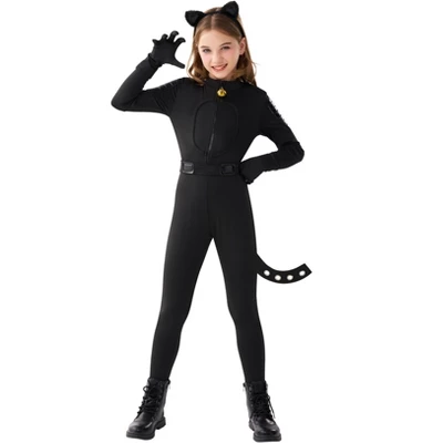 - With this black cat costume, you’re not just dressing up—you’re embracing the feline charm. The combination of the bodysuit, belt, headband, and gloves creates a complete and enchanting look that’s perfect for any occasion. Transform into a mysterious cat and make every event a magical adventure.