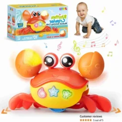 - Dancing Crab Baby Toy: Helps Baby Crawl Your little will absolutely attracted by the way the crab crawls. The baby will try to crawl towards and catch it. Of course, because of the obstacle avoidance sensor, they could never catch it.