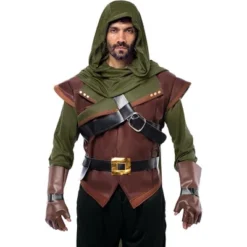 - Men’s Medieval Robin Hood of Nottingham Costume, includes Men’s Leather Tunic with Long-sleeve shirt, Hood, Vest, and Cape, 2 Gauntlet Gloves, Belt with Pouch, a Pair Pants with Boot Covers! (Arrows and Bow not included)