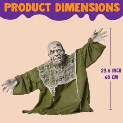 Designed to bring surprise and delight to trick-or-treaters and Halloween enthusiasts alike, our groundbreaker zombie with movable arms appears to be breaking through the ground in your yard, adding an element of shock and horror to your Halloween display. Suitable for both indoor and outdoor use, this Halloween decoration helps you set the perfect horror scene for your home, graveyard displays, or outdoor Halloween party. Crafted with quality in mind, this groundbreaker is built to last and promises to deliver a fantastic and spine-tingling experience. Terrify your neighborhood with our life-like Undead Groundbreaker! This creepy crawling zombie features moving arms for the perfect yard haunt this Halloween.
