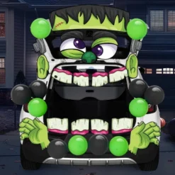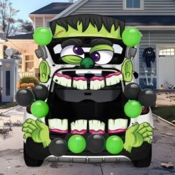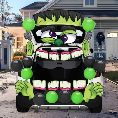 - Our Halloween Frankenstein face trunk or treat car decoration includes 1 huge forehead design, 2 huge eyes, 2 ears, 2 hands, 2 bolt nostrils, fangs, and 12 balloons coloring in black, green, and 60 dot glues. Come with Weather Resistant Double Sided Stickers.
