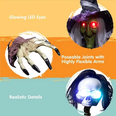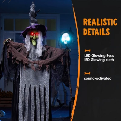 Hanging Witch with Light-Up Skeleton Wand – Realistic Halloween Decoration. Elevate your Halloween décor with our life-like Hanging Witch! Designed with eerie details—wrinkled face, gray tangled hair, and a flowing tattered gown—this creepy witch decoration casts a haunting spell over your space. Her light-up skeleton wand adds a chilling glow, perfect for Halloween haunted houses, porch displays, or yard decor. Intricate textures and dynamic posing make her appear to float or follow passersby—ideal for scaring trick-or-treaters or wowing party guests. Simply suspend light up hanging witch from trees, ceilings, doorways, or windows (indoors/outdoors). Sound-activated for eerie surprises (requires 3 AAA batteries, not included). Perfect for outdoor halloween decorations, haunted house props, Halloween party decor, or even as a window silhouette.