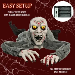 The ultimate Halloween decoration zombie for thrill-seekers! Measuring 44 inches wide, this detailed undead creature appears to be clawing its way out of the ground, complete with bloodstained arms, glowing red eyes, and a horrifyingly realistic face that will shock even the bravest visitors. What makes this zombie groundbreaker truly special is its sound-activated terror. When trick-or-treaters or party guests come within 20 inches, motion sensors trigger bone-chilling screams while the zombie’s eyes flash menacingly (requires 3 AA batteries, not included). Made from high-quality latex, fabric, and plastic, this durable prop is perfect for both indoor Halloween parties and outdoor haunted yard displays. Whether you place it by your porch stairs, in your garden graveyard scene, or at your entryway, this interactive Halloween prop delivers non-stop scares all season long.
