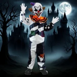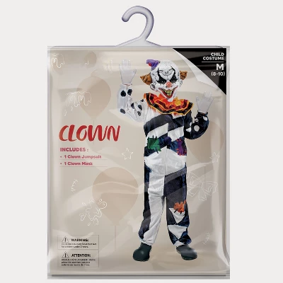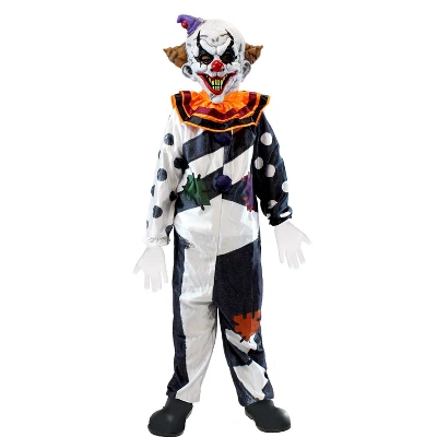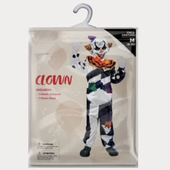 - Transform your child into a spooky clown with this adorable costume. Perfect for Halloween, haunted house events, scary farm parties, theater plays, and everyday fun. Available in sizes Small (5-7 yrs), Medium (8-10 yrs), Large (10-12 yrs).