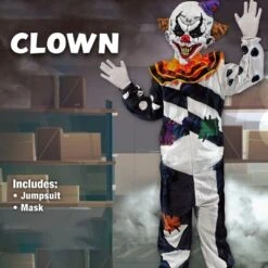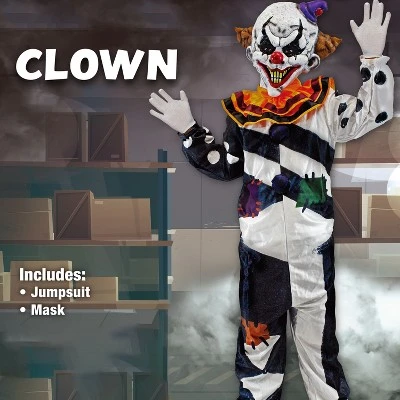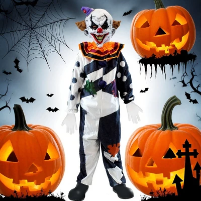 - Our unisex creepy clown costume includes a jumpsuit and a full-head mask with a little hat. This deluxe set is perfect for creating a realistic and spooky clown look. (Note: Gloves and shoes are not included.)