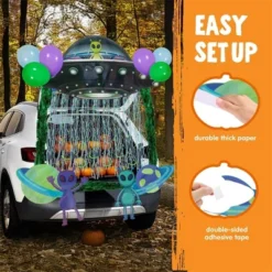 The centrepiece of this UFO aliens trunk or treat, whose striking design will make your automobile stand out from the crowd. This decorating kit is ideal for adding a dash of festive excitement to your Halloween celebrations, whether you set it on the front of your open trunk, the front of your car, or use it indoors. With the accompanying double-sided stickers, our trunk or treat automobile decoration kit may be easily attached to any surface. Trunk or treat games are a Halloween staple! Let’s ensure the kids don’t miss out on the fun! It is perfect for decorating garages, doors, arches, entrances, corridors, and, of course, cars because you can use it to attach decorations to walls or other indoor and outdoor surfaces. The trunk or treat boards are made from premium thick paper materials and are reusable, so you may use them again and again. The double-sided removable adhesive tape also makes cleanup after the Halloween festivities a snap because it leaves no damage or residue.