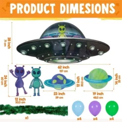 - Complete Halloween Decoration. Everything you need for an eye-catching display, featuring a UFO paper board (62″x28″), 2 planets, 2 aliens, balloons, and more. No extra pieces required, just unpack and decorate.