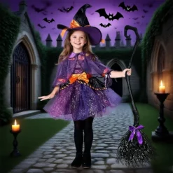 “Brew Up Some Magic with This Wicked Purple Witch Costume! ✨🧹”Dress your little sorceress in this spellbinding ensemble—complete with a hat, dress, cape, belt, and a ribbon-decorated broom (mix & match colors for extra charm!). Made from super-comfy polyester, it’s durable for potion-making mischief and Insta-worthy spellcasting at Halloween parties, school plays, or wizardly adventures.✨ Why Love It?✔ 5 ribbon colors for personalized broom flair✔ Ultra-comfy & easy wear—no itchy witch problems!✔ Perfect for Hocus Pocus, Oz, or fairy tale fun✔ SAFE & tested—just hand wash & line dry (no vanishing spells needed!).