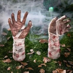 - 30″ Zombie Hand Lawn Stakes – Life-sized plastic zombie hands create terrifying “emerging from ground” effect.