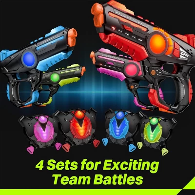 This laser tag set is designed for thrilling battles, featuring 4 laser tags and 4 vests, making it ideal for family or friend teams. Each unit operates on 3 x 1.5V AAA batteries (required but not included). The set is fully compatible with existing equipment and can be expanded with additional tags and vests to accommodate larger battles. With multiple game modes, it caters to diverse combat preferences, allowing players to switch modes based on personal taste or battlefield demands. Whether you prefer team play or solo challenges, this set delivers an immersive combat experience and endless entertainment. Available in vibrant colors, the set meets personalized preferences while ensuring easy identification of equipment for each player. Beyond aesthetics, the advanced sync and display technology enables real-time updates on life and team data, with clear electronic displays showing bullet counts. This feature keeps players informed about the battle status at all times. It not only brings joy and excitement but also strengthens family bonds through shared experiences. Whether played indoors or in the backyard, it fosters teamwork and healthy competition, creating lasting memories for everyone involved.Perfect as a family gift, Easter gifts, Halloween gifts, Christmas gifts, New Year gifts, party game gifts, as well as 8 9 10 11 12 13 14 year old kids birthday gifts, especially gifts for teen boys.