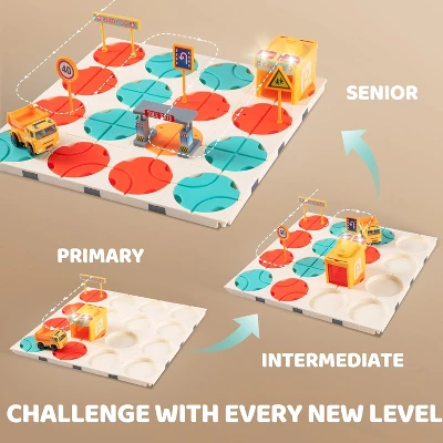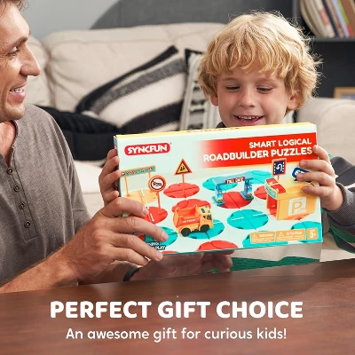 - Rich Accessories: Made of high-quality, BPA-free materials with non-toxic water-based paint, this STEM toy is safe and durable. The set includes 2 straight tracks, 14 reversible straight tracks, curved tracks, 16 baseboards, 1 electric construction vehicle, 1 starting point, 1 light and sound garage, and 5 road sign accessories. This puzzle toy is recommended for ages 3-7 and makes an excellent choice for Montessori toys