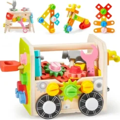 - Versatile Wooden Tool Box: This vibrant and multifunctional wooden tool box serves more than just organizing tools and accessories—it can transform into a workbench, storage case, or even a small vehicle. Designed to inspire creativity and logical thinking, kids can assemble the tools into fun shapes like flowers, windmills, and scooters, fostering an early interest in building and construction. Ideal for toddler boys and educational play.